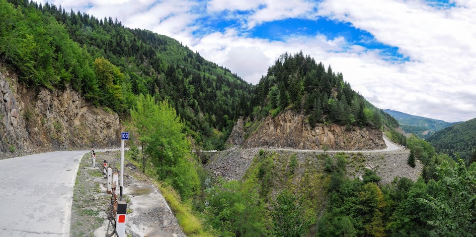 Дальше начинается длиннющий серпантин вверх. Дорога узкая – едем, прижимаясь к обочине, на сколько это возможно. Здесь меня обгоняет шоссер со словами «Hello! Ukraine – cool!» Он уже успел пообщаться с Витей. Оказалось, что это профессиональный спортсмен из Батуми. На этом серпантине он часто тренируется. Подъем нас изрядно утомил. В награду себе – съедаем арбуз, сидя на крыше магазина – там у них летняя площадка.