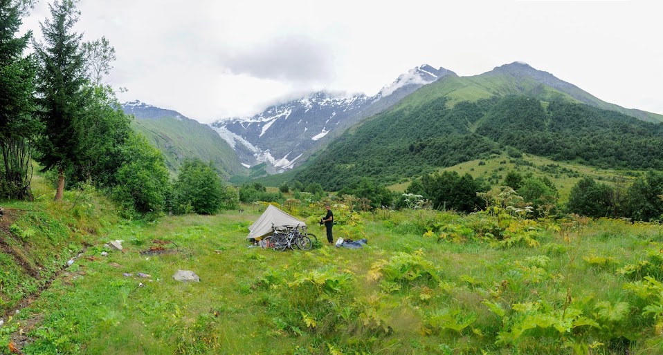 Падал дождь, а мы, натянув на себя всю имеющуюся одежду, грелись под тентом возле горелки, неохотно извергающей своё синее пламя, взирая на высоту, а именно 1974 м над уровнем моря. Суп из остатков овощей варился долго, и так не сварился. Но сванская соль делает любую похлёбку кулинарным шедевром, а горы Сванетии, особенно столь большие и красивые, удивительным образом усиливают вкусовые рецепторы. Ну и голод, и усталость, и настроение... Так что было вкусно.