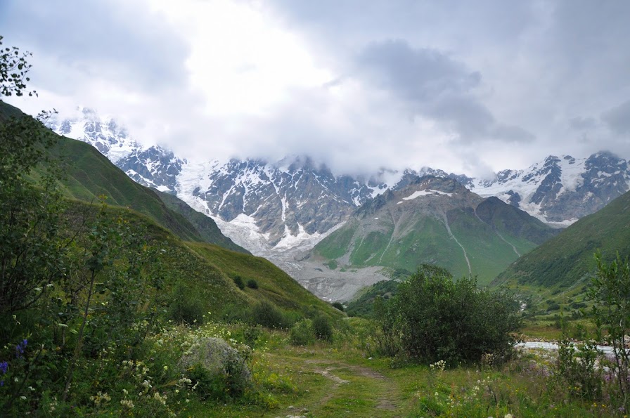 Витя остался на хозяйстве, а мы потопали в сторону красавицы Шхары. Для меня это было первое знакомство с большими горами, точнее возможность приблизиться к ним. Масштабы, монументальность всего этого впечатляет.