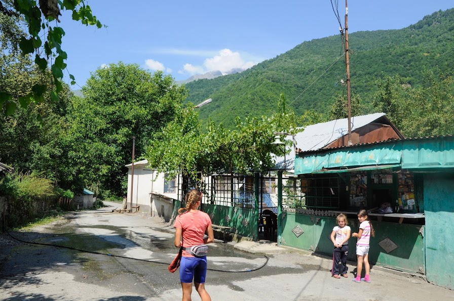 По пути в одном селе увидели ларёк. Выбор здесь конечно не ахти большой, но нужные консервы можно найти. Продавец не владела русским. Возникли трудности понимания. Чтобы сделать покупки, мне пришлось войти вовнутрь ларька и, как в супермаркете, всё выбрать. Ни хлеба, ни сухарей, ни овощей здесь не купишь. Вместо хлеба взяли палочки-соломку. Возле магазина расположены столики. Пришла ещё одна женщина. Мы спросили их, делают ли они кофе. Женщины перекинулись между собой словами на грузинском. Было видно, что к ним не часто обращаются с подобной просьбой. Но оказалось, что дом одной из них находится рядом и женщина любезно сварила и преподнесла нам вкуснейший кофе по-турецки. Общались с дамами на мигах, вставляя отдельные грузинские и русские слова, но таким образом удовлетворили привычное любопытство.