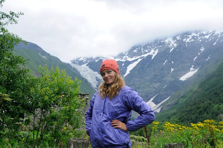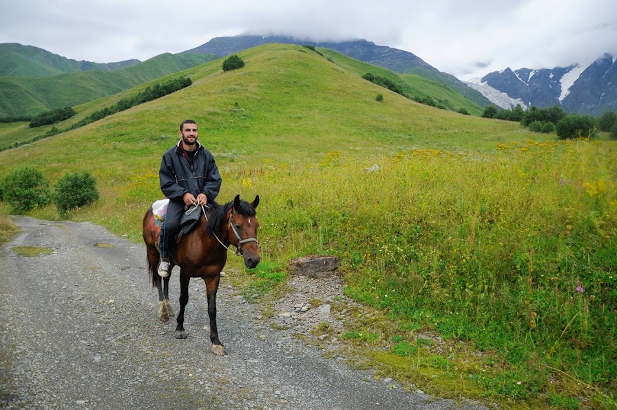 Нам встречались и другие туристы. Сначала увидели немца, соло-пешеходника, который как раз спускался вниз. Обратила внимание, что рюкзак его было очень маленький, как для пешеходного туриста. Видимо палатки он не носит, так как останавливается в хостелах, отелях или у гостеприимных местных жителей. Кстати, наши друзья испанцы рассказали, как попали на ужин в одну грузинскую семью – бедняги не могли выйти из-за стола, пока их окончательно и бесповоротно не почтят как гостей. Ну а немец вчера спустился с Ушгули. Вкратце рассказала ему и о нашем путешествии и дальнейших планах. Долго поговорить не удалось. Нужно было догонять ребят.