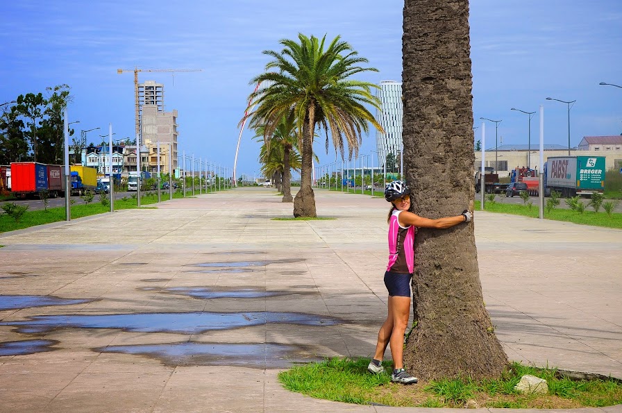 Оказалось, что паром на этот раз отправляется не из Батуми, а из Поти. Но на наши планы попасть в Батуми это уже не влияло. Было достаточно времени, чтобы посмотреть Батуми и доехать в Поти – а именно 2 дня. Как и планировали, направляемся в Мартвили, где собираемся закончить официальную часть велопохода. В этот городок ведёт очень затяжной спуск. Где-то в начале посёлка у нас по пути был потрясающий каньон, но мы его проехали, увлекшись скоростью. Когда поняли, что мы такими темпами проедем и Мартвили, свернули в сторону реки. По дороге на «пляж» пообщались с местным мужчиной, который нам и рассказал, что каньон остался позади, и подсказал, где здесь можно искупаться. Приглашал нас в гости, но мы вежливо отказались. Но уехать с пустыми руками он нам всё-таки не позволил – вручил домашнюю чачу.