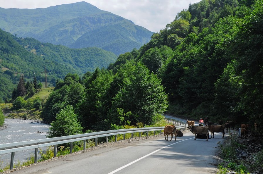 Продолжили движение. Мимо нас проносились сёла и маленькие города, горы и реки, реки и горы… Раскалённый асфальт быстро забирал последние силы. Мы аккуратно объезжали коров, умиротворённо лежащих на дороге. Машинально поднимали руку сигналящим, проносящимся мимо нас автомобилям в знак приветствия или понимания предупреждений.